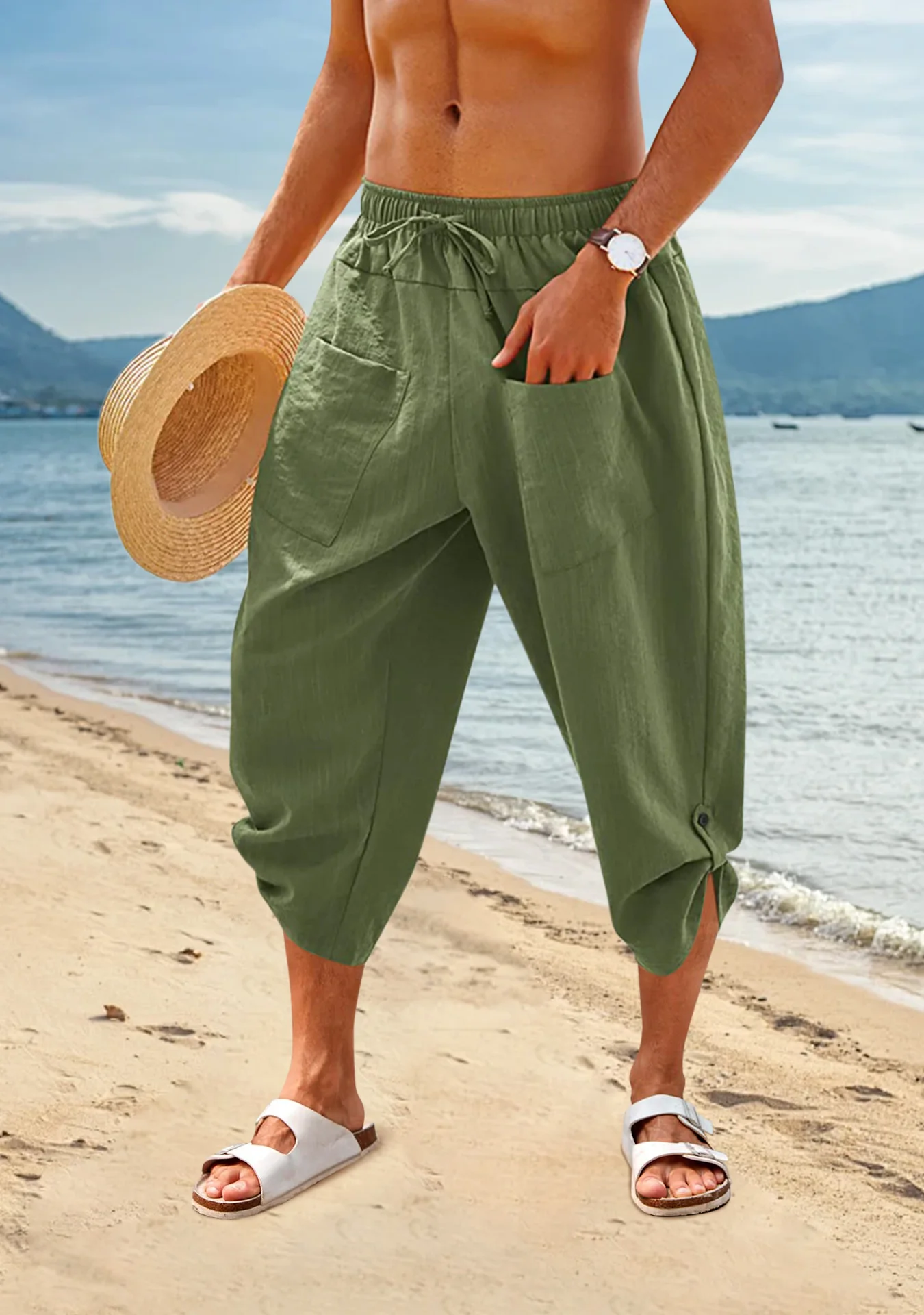 Mens linen shorts with loose fit and drawstring, made from cotton-linen blend. Perfect for casual beachwear or summer outings, these 3/4 length shorts offer comfort and relaxed style.