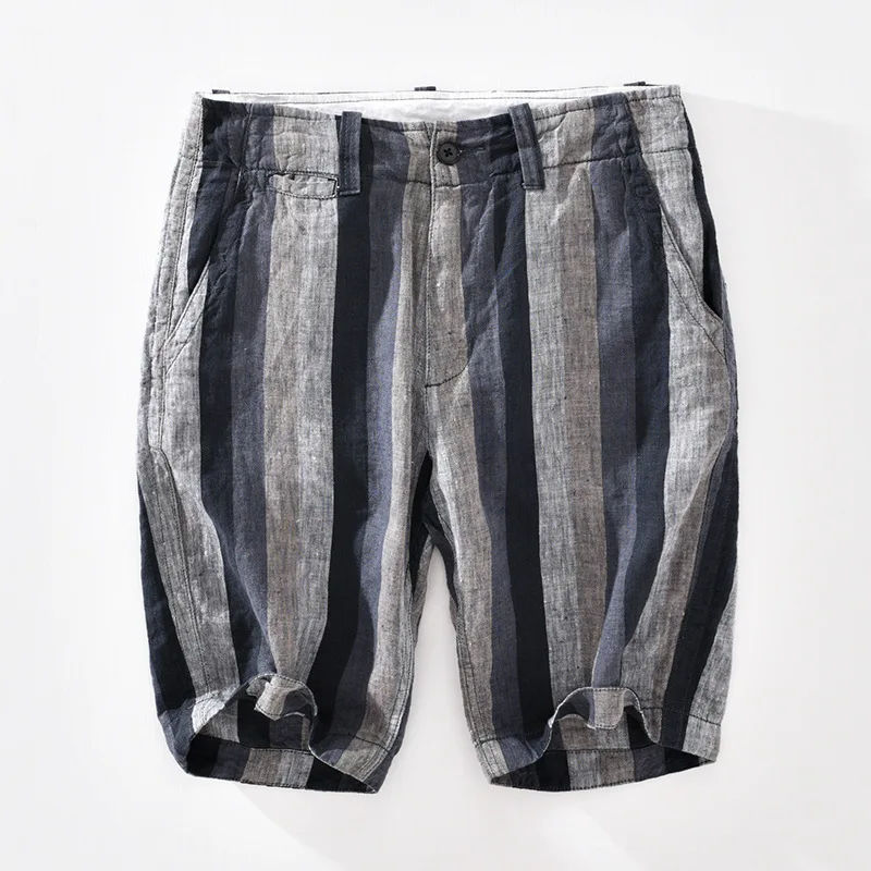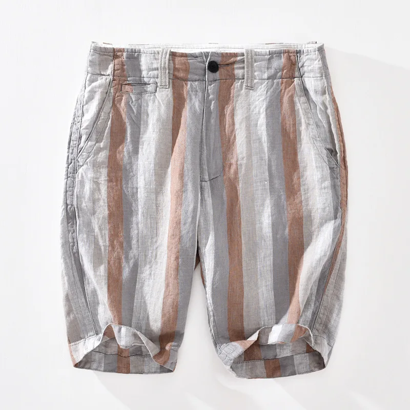 Striped mens linen shorts with thin, loose design for summer. These stylish linen shorts for men offer breathable comfort, perfect for beachwear and casual daily outfits in hot weather.